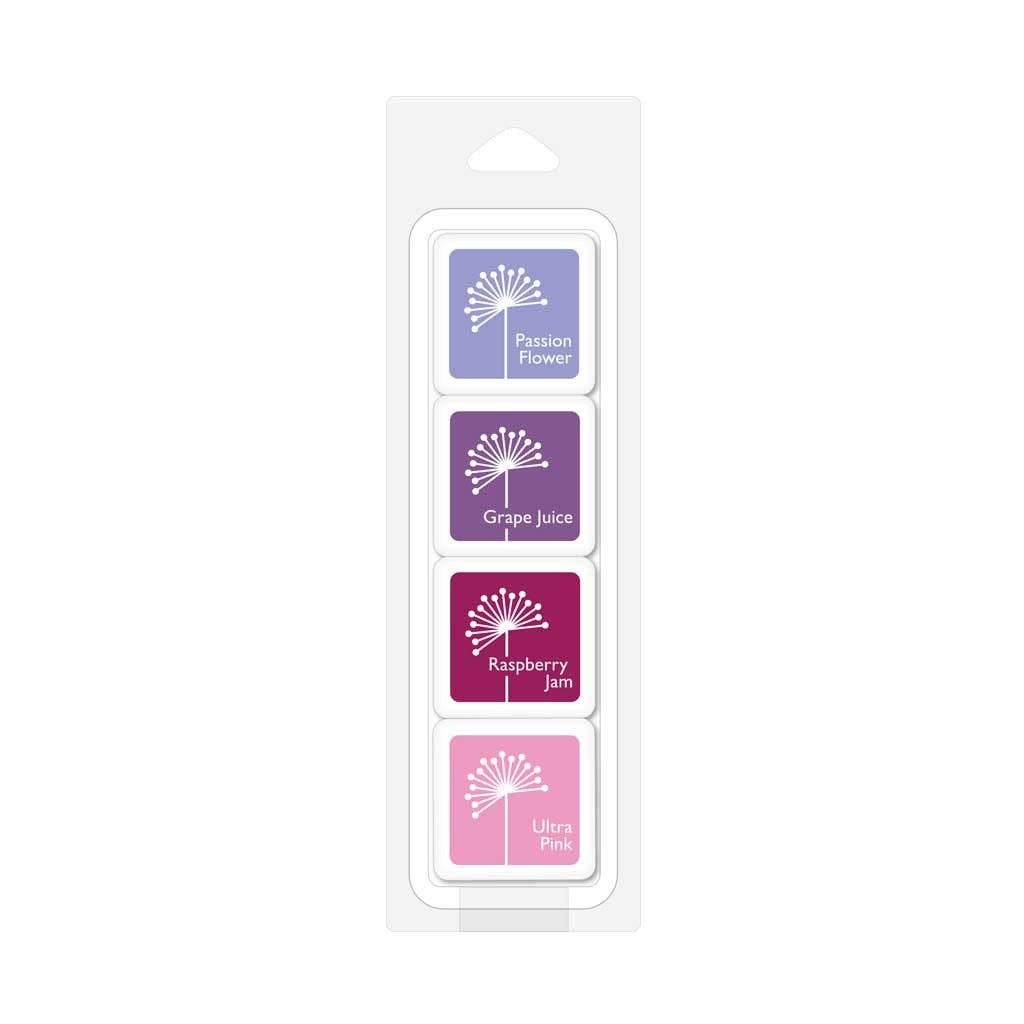 A four-pack of 1.25" x 1.25" cubes in purples and pinks. Includes Passion Flower, Grape Juice, Raspberry Jam, and Ultra Pink inks.