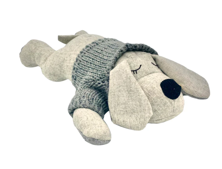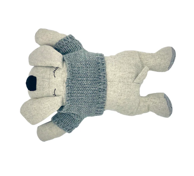 Miles, the quirky dog who loves bubble baths and singing loudly. Made with soft wool blend fabric and sporting a knitted Australian merino wool grey jumper, Miles loves books and reading with his Gran.