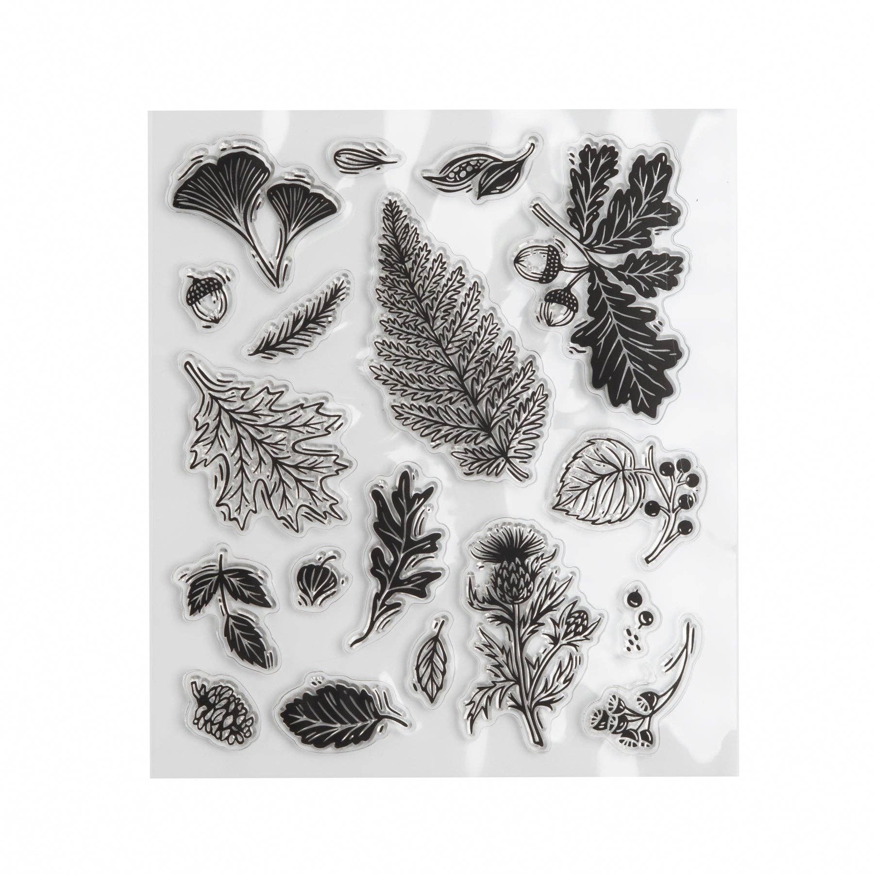 Forest Foliage Acrylic Stamp Set An 18-piece clear acrylic stamp set featuring hand-illustrated leaves, berries, seed pods, and botanical elements. Ideal for autumn-themed journaling, cardmaking, and seasonal spreads. * 18 individual clear acrylic stamps * Includes oak, maple, fern, pine, thistle, and acorn designs * Made with high-quality clear acrylic * Works with standard acrylic blocks and ink pads * Coordinates with Forest Findings and seasonal collections