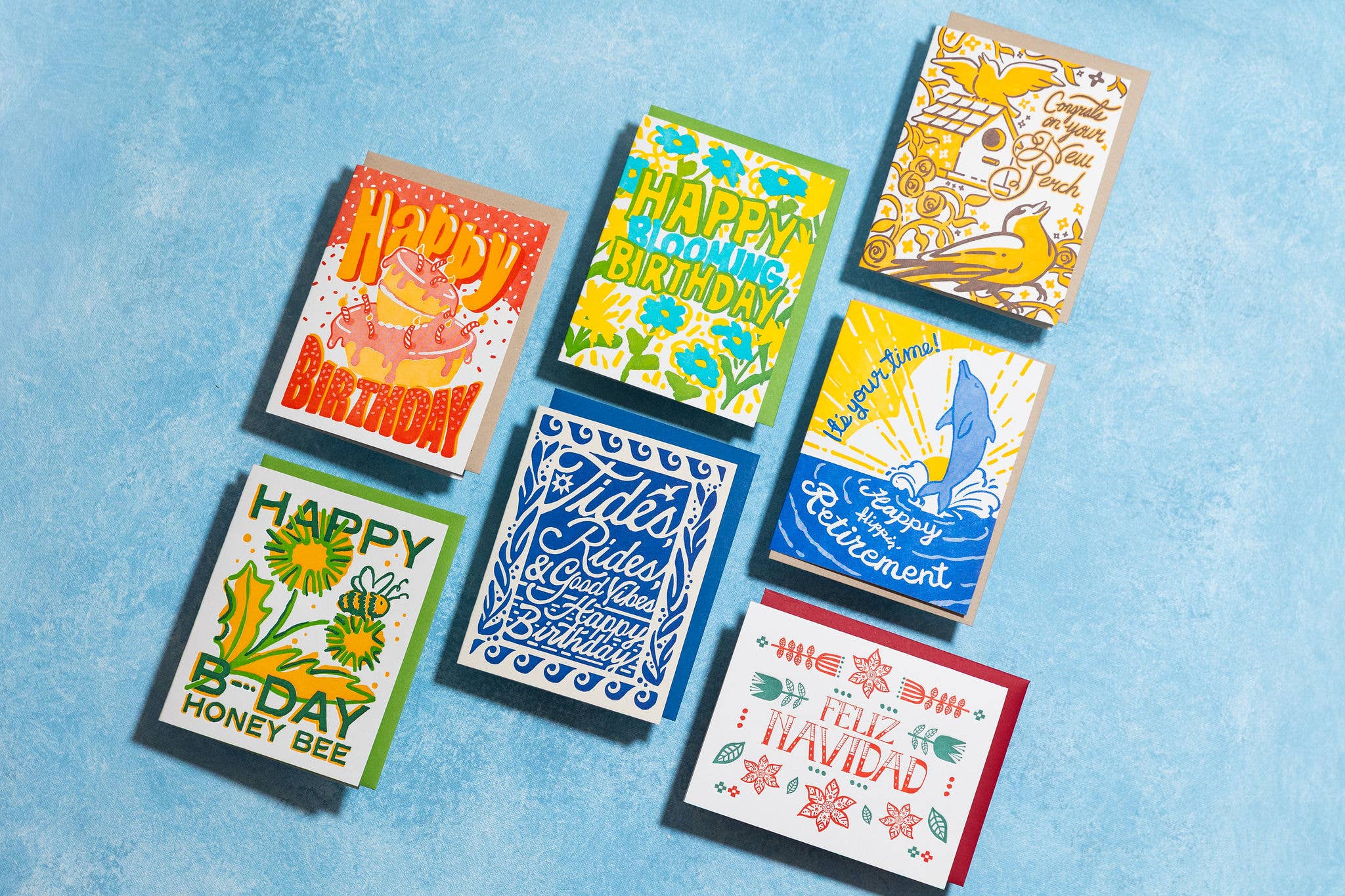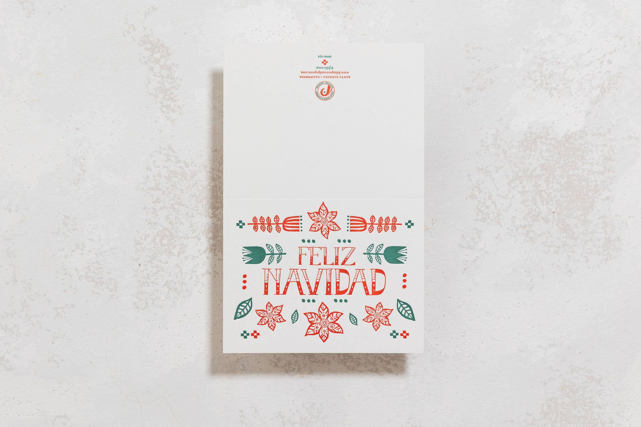 A Mexican folk art inspired Christmas greeting! Letterpress A2 card with deep-flap envelope. Designed and printed in-house in Santa Barbara, CA on folio's 1953 Heidelberg Windmill platen press. Printed on 140# French Muscle tone paper.