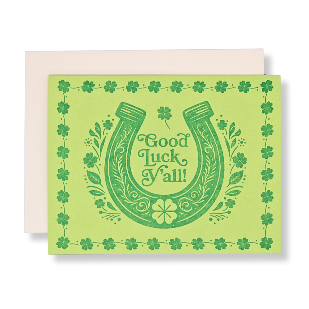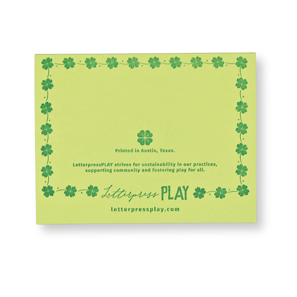Wish for a healthy dose of luck for someone in your life with our St. Patrick's Day Luck Card! This handmade letterpress card features a blank interior where you can write your own well wishes or personal note. Our eco-friendly cards are letterpress printed with polymer plates on recycled paper and packaged in a biodegradable clear sleeve.