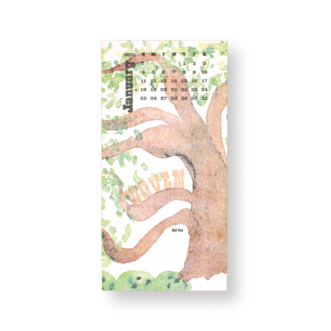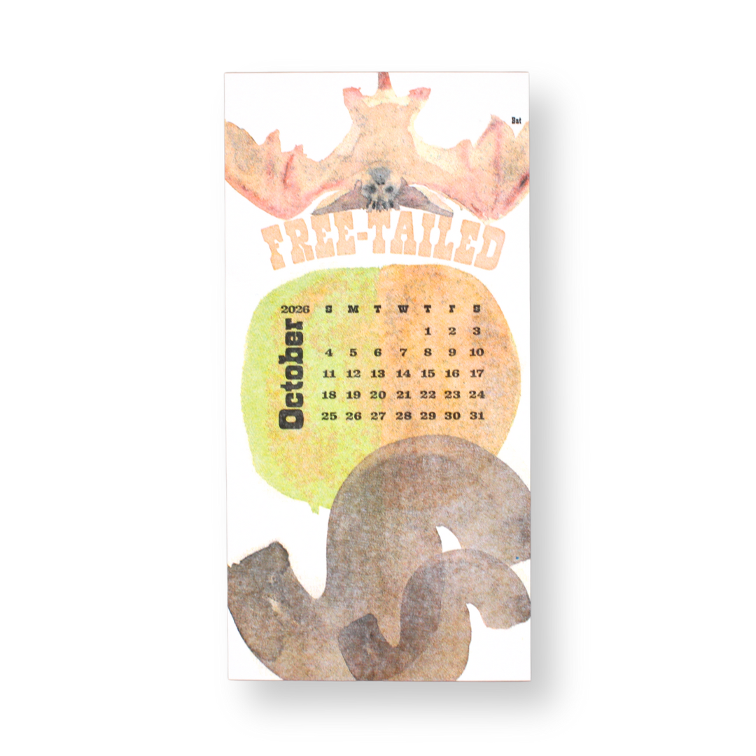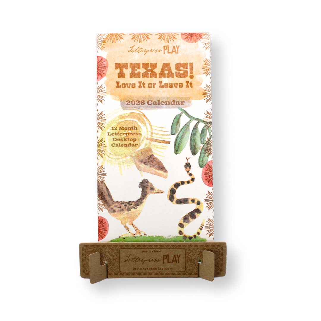 A 12-month letterpress desk calendar created by our Founder Kyle Hawley, this calendar is the perfect way to ring in 2026—the Texas way. Each month card is letterpress printed by hand, right here in our Austin, Texas, giving this calendar a special, handmade touch.