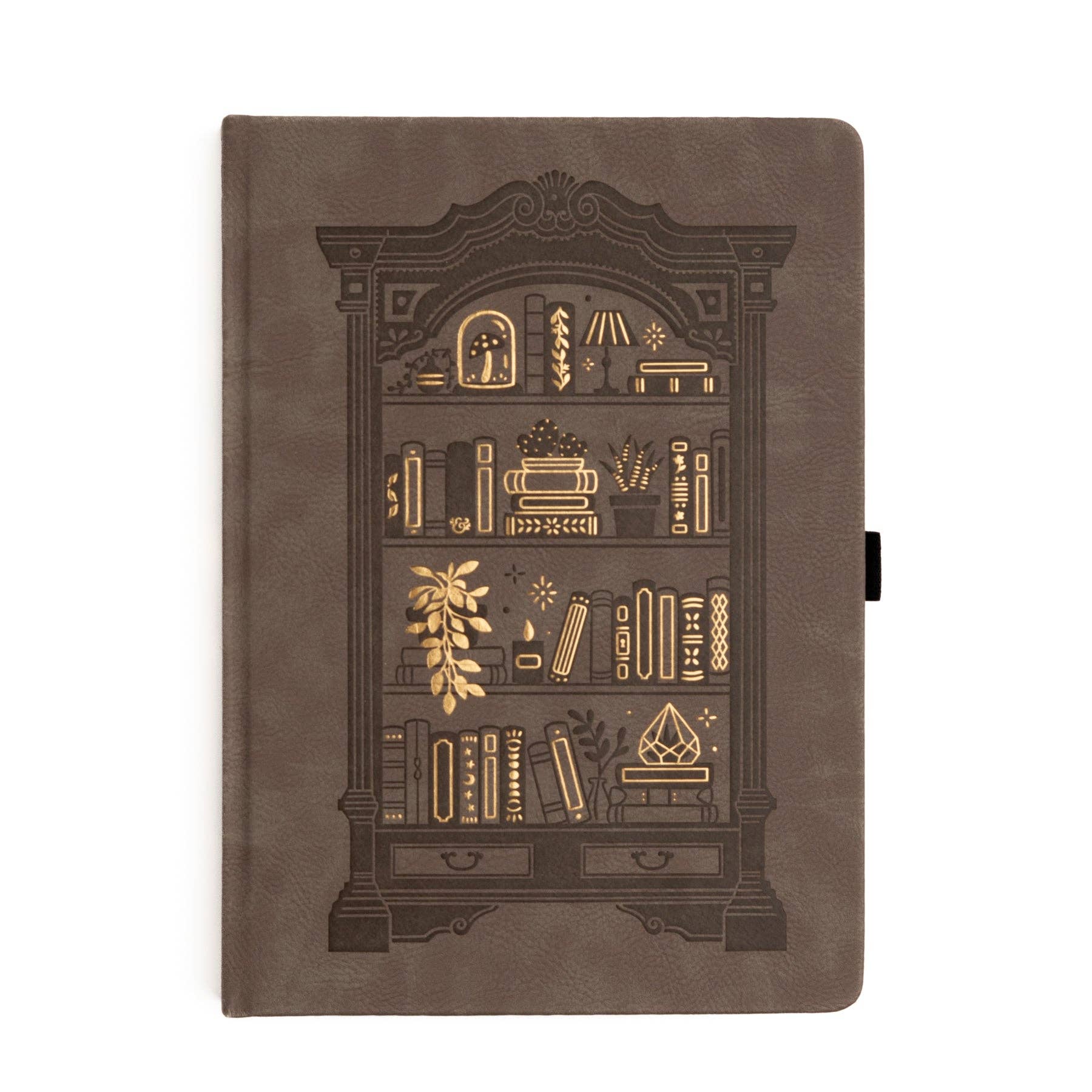 The B5 Bookshelf Notebook is a favorite among creatives who crave room to plan, design, or journal. The cover artwork features a detailed bookshelf scene in metallic foil and debossing, offering vintage library vibes in a modern, elevated form. Filled with crisp 160gsm dot grid paper for a flawless writing experience. * 6.93" x 9.84" * 160 dot grid pages * 160gsm bright white paper * Includes: Back pocket, pen loop, elastic closure, ribbon bookmark * Cover: Vegan leather with foil + deboss