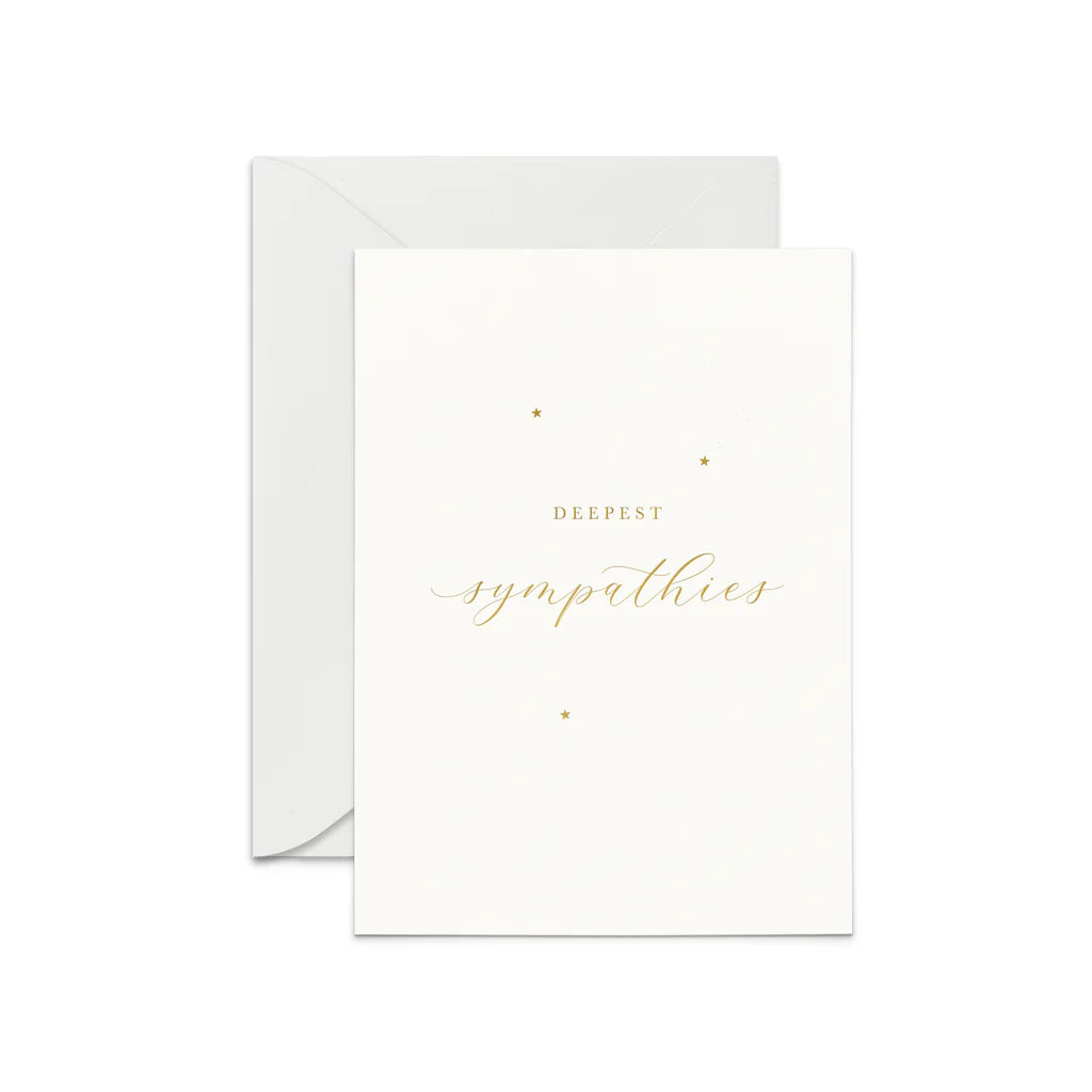 This Deepest Sympathies card is foil stamped on luxe heavyweight textured cardstock. Gold foil on white paper. Folded card with blank interior and envelope.