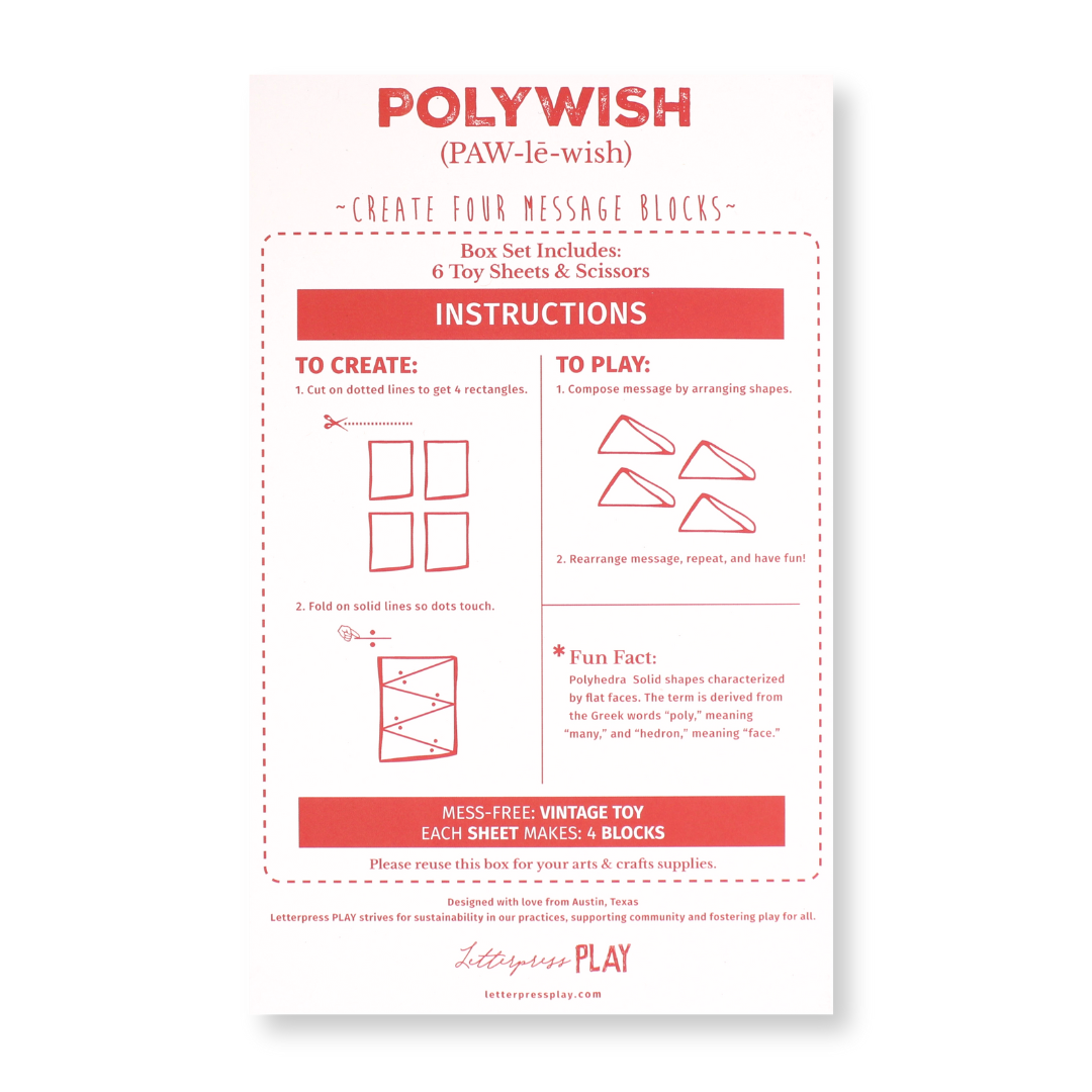 Simply follow the printed instructions on the back of the box to create four polyhedra blocks that display exciting messages! Best of all, this sustainable, eco-friendly toy is handmade with care from recycled materials.