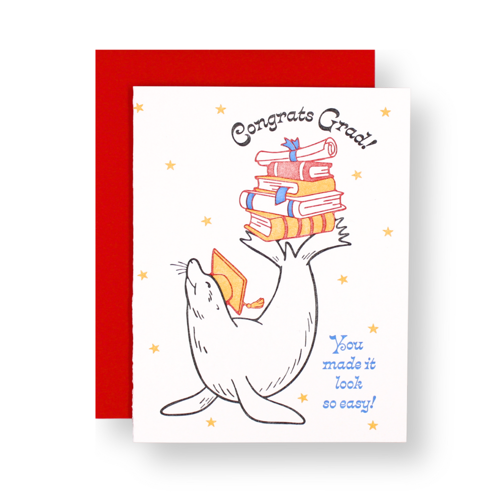 Celebrate the accomplishments of the newest graduate with this adorable celebratory Seal Graduation Letterpress Card. Made with 100% recycled paper and bio-degradable packaging, it's not only cute but environmentally friendly. A blank interior also awaits your own personalized and heartfelt message.