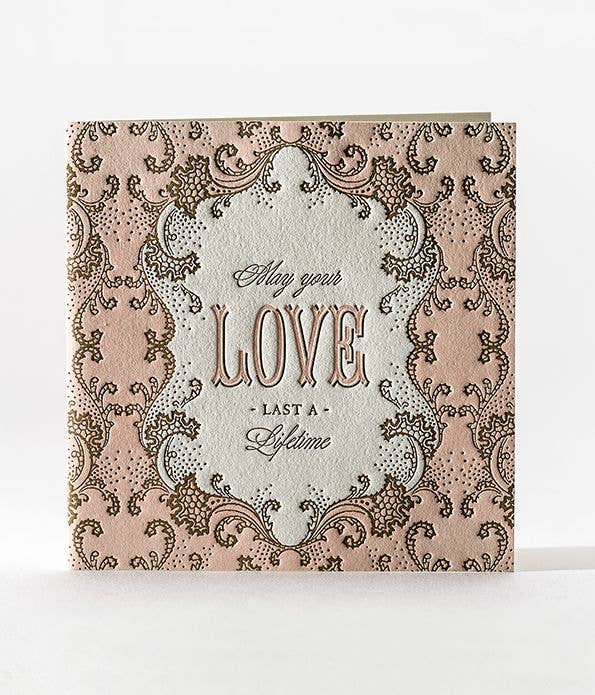 Share a timeless sentiment with the Gilded Love Square Letterpress Card – a refined expression of affection with a touch of elegance. Featuring a minimalist square format and subtle gilded details, this card adds a golden spark to any heartfelt message. Expertly crafted in San Diego, CA, each card is letterpress printed using vintage presses, eco-friendly soy-based inks, and soft, 100% repurposed cotton rag paper. Product Features: Elegant gilded love design in a unique square format Folded size: 5" x 5" Letterpress printed by hand with soy-based inks Printed on sustainable 100% repurposed cotton rag paper Blank inside for your personal message Includes envelope (color may vary), individually packaged in a clear protective sleeve A sophisticated way to celebrate love, connection, and golden moments.