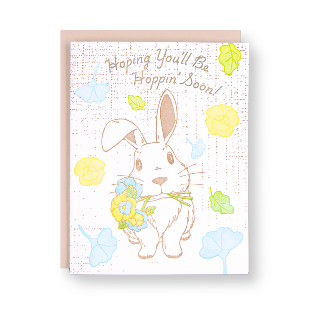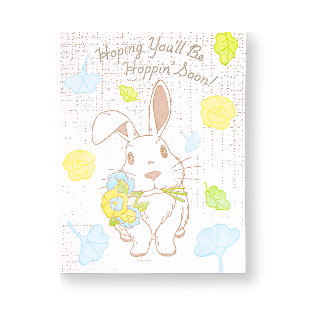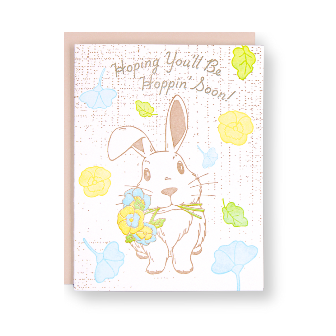 Send your well wishes to someone with our Bunny Get Well Soon Letterpress Card featuring the phrase, "Hoping you'll be hoppin' soon!" Made with 100% recycled paper and bio-degradable packaging, a blank interior also awaits your own personalized and heartfelt message.