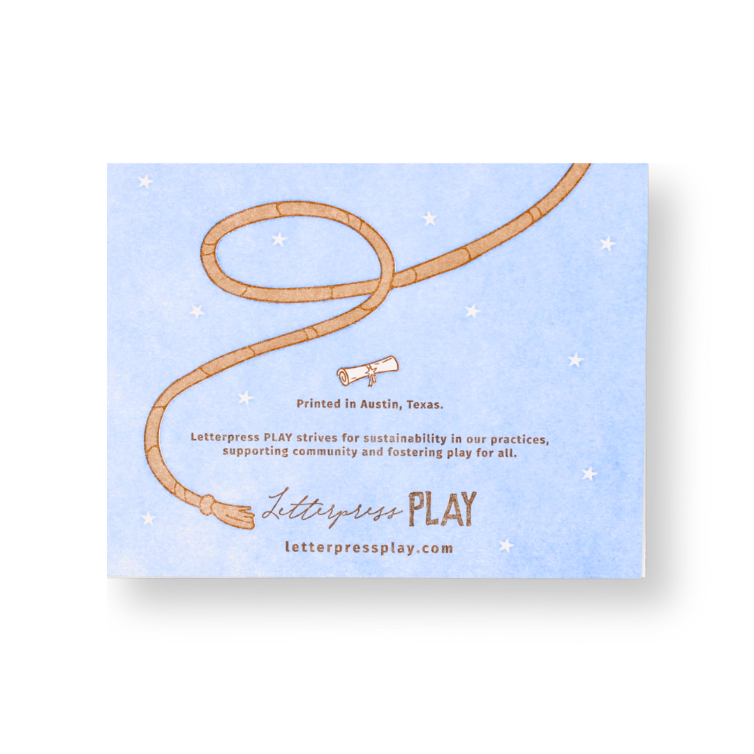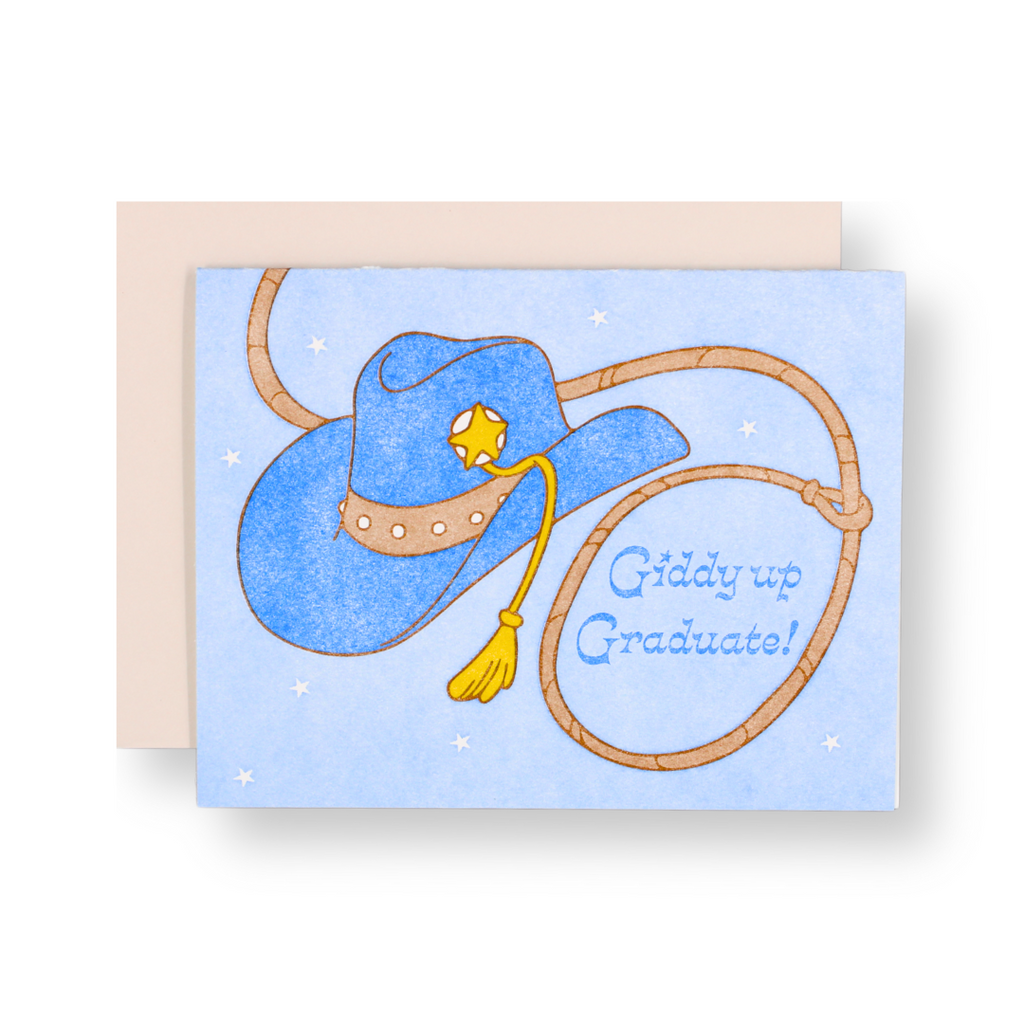 Celebrate the accomplishments of the newest graduate with a Giddy-up Graduate Letterpress Card. Made with 100% recycled paper and bio-degradable packaging, it's not only cute but environmentally friendly. A blank interior also awaits your own personalized and heartfelt message.