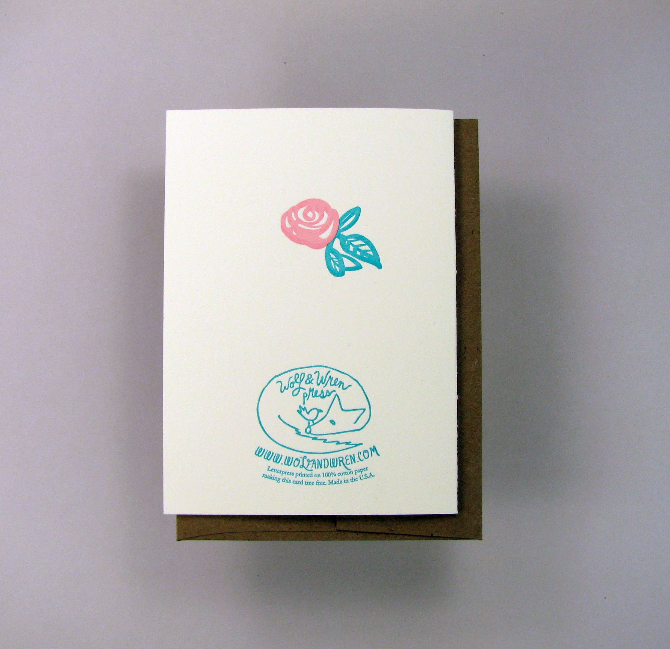 Letterpress printed on a Heidelberg Windmill press. 4Bar (3.5" x 4.875”). Blank on the inside. Printed on 100% cotton ecru paper. Packaged in a protective plastic sleeve.